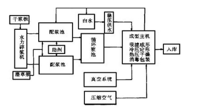 生產線是由兩臺真空模塑成形主機系統和與主機規模相適應的輔助系統所組成, 其生產工藝如下:原料甘蔗漿(干漿或濕漿) 制漿,配漿,輸漿,成型主機(注漿、吸濾成形、熱壓定型、真空熱干),切邊,檢驗,成品消毒、包裝,入庫。